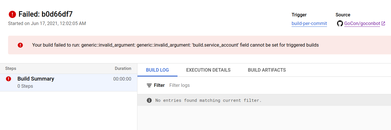 User-specified service accounts only work with manual builds; they don’t work with build triggers.